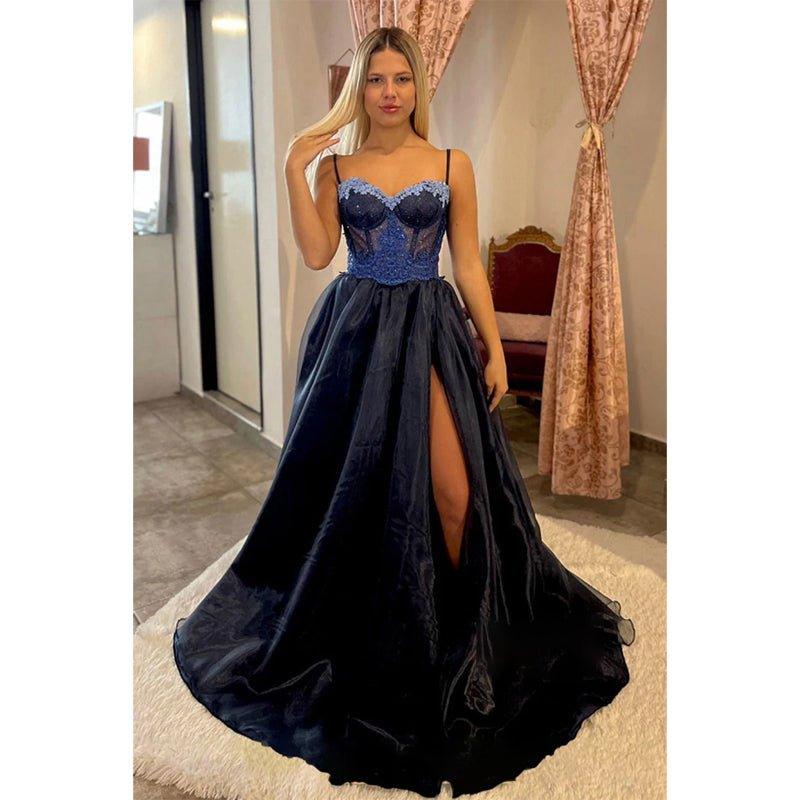 Vestido largo de fiesta con tirantes finos, corte en A, apliques de encaje y lentejuelas.