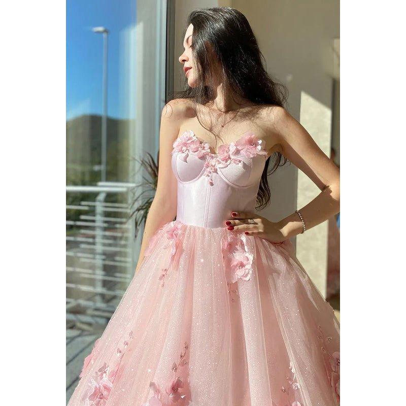Vestido de fiesta formal de noche sin tirantes, corte en A, con apliques de tul y sin mangas.