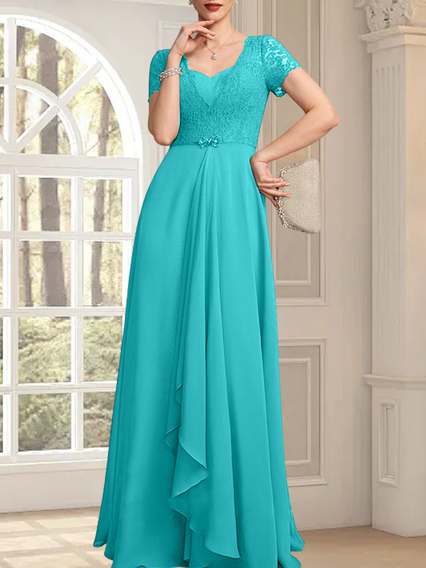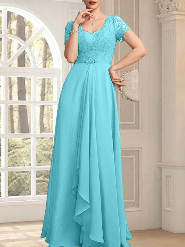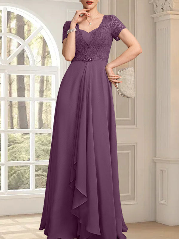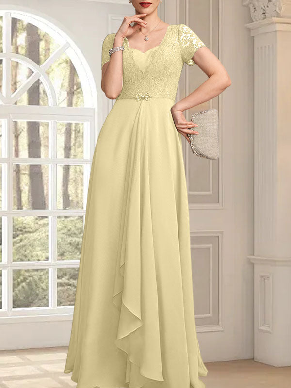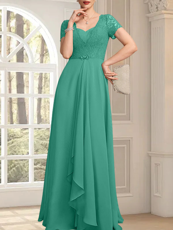 Vestido de corte A, escote corazón, largo hasta el suelo, de gasa, encaje, con cuentas y volantes en cascada para la madre de la novia.