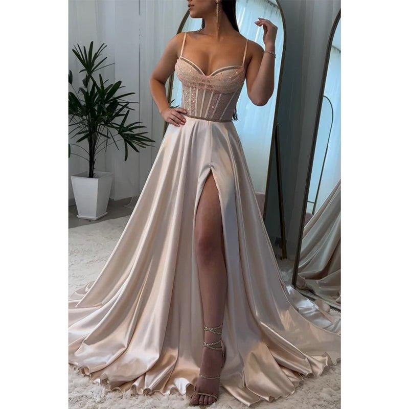 Vestido de fiesta de noche con escote corazón, corte imperio ilusión y abertura lateral