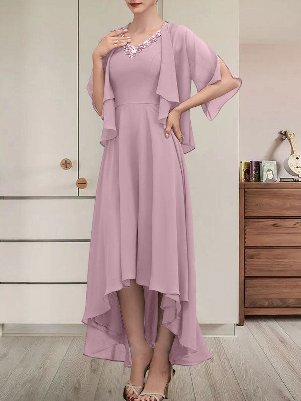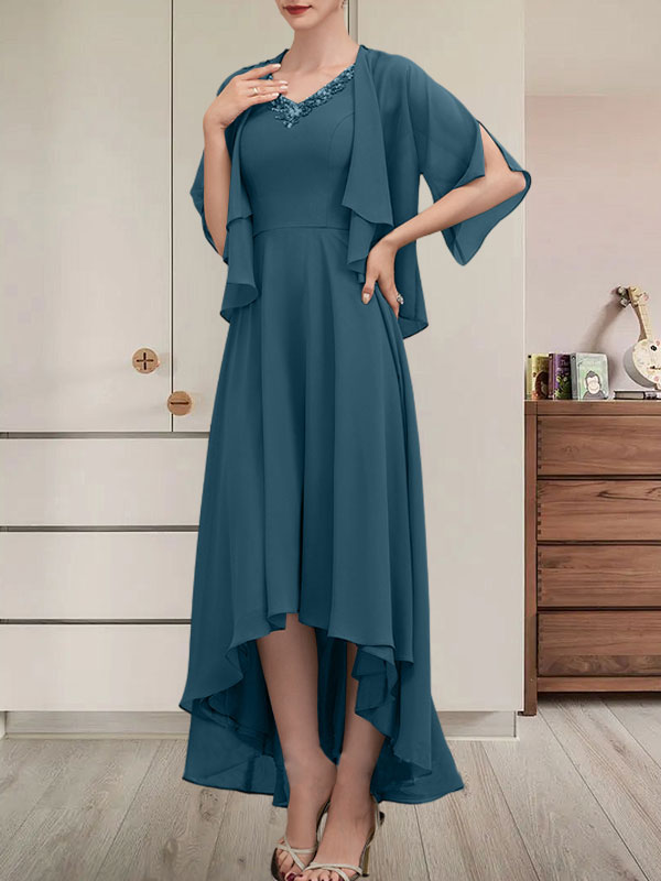 Vestido de corte A, escote en V, asimétrico, de gasa, para la madre de la novia, con lentejuelas y pedrería.