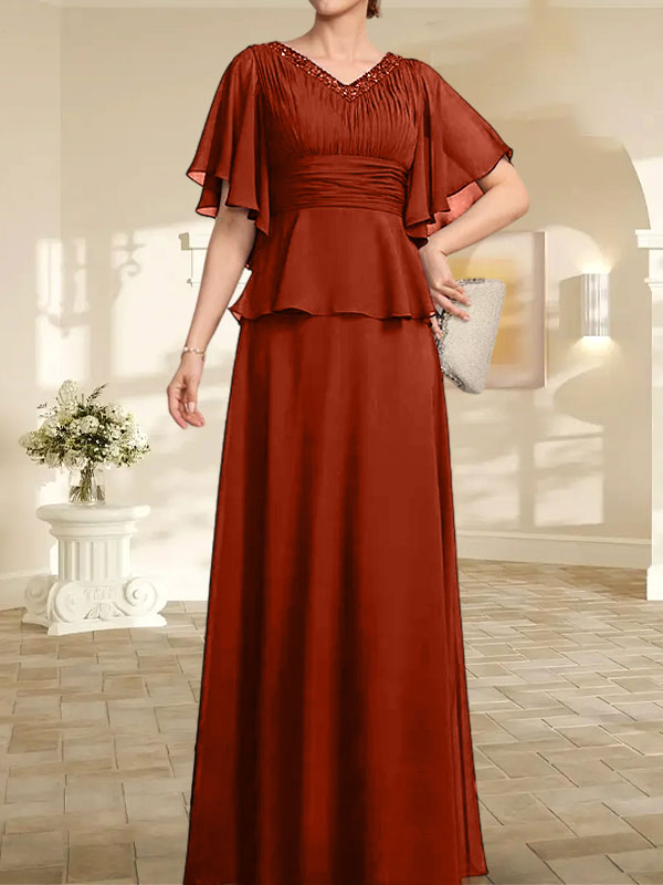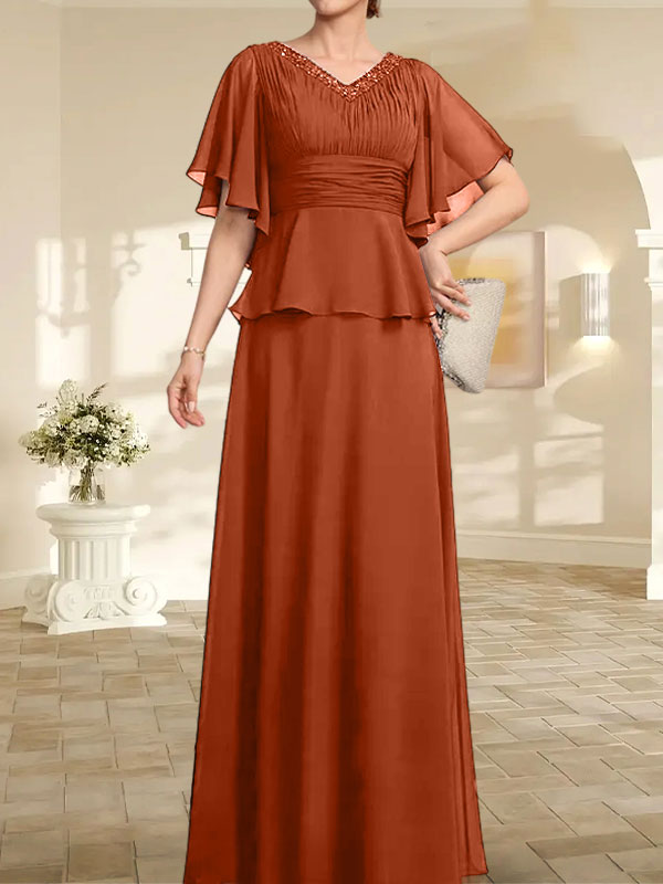 Vestido de gasa de corte A, escote en V, largo hasta el suelo, para la madre de la novia, con plisados ​​y cuentas.