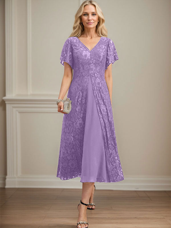 Vestido de novia de gasa de encaje, corte en A, escote en V y largo hasta la rodilla.