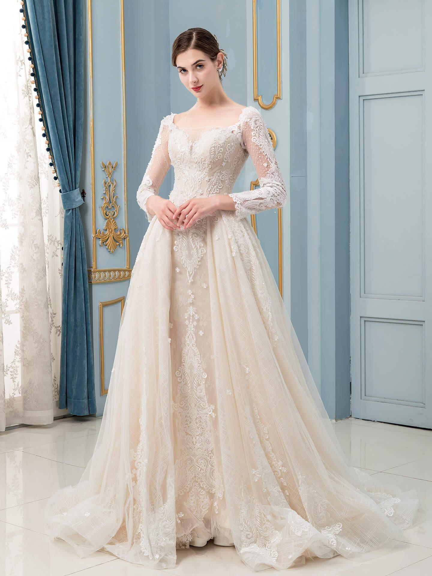 Vestido de novia de corte A/sirena con encaje, cuentas y escote en V, manga larga, largo hasta el suelo