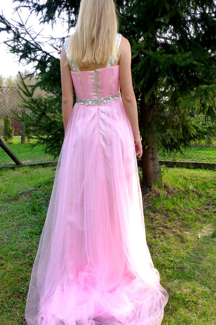 Vestido de graduación largo hasta el suelo, corte en A, tirantes anchos, tul trenzado con pedrería
