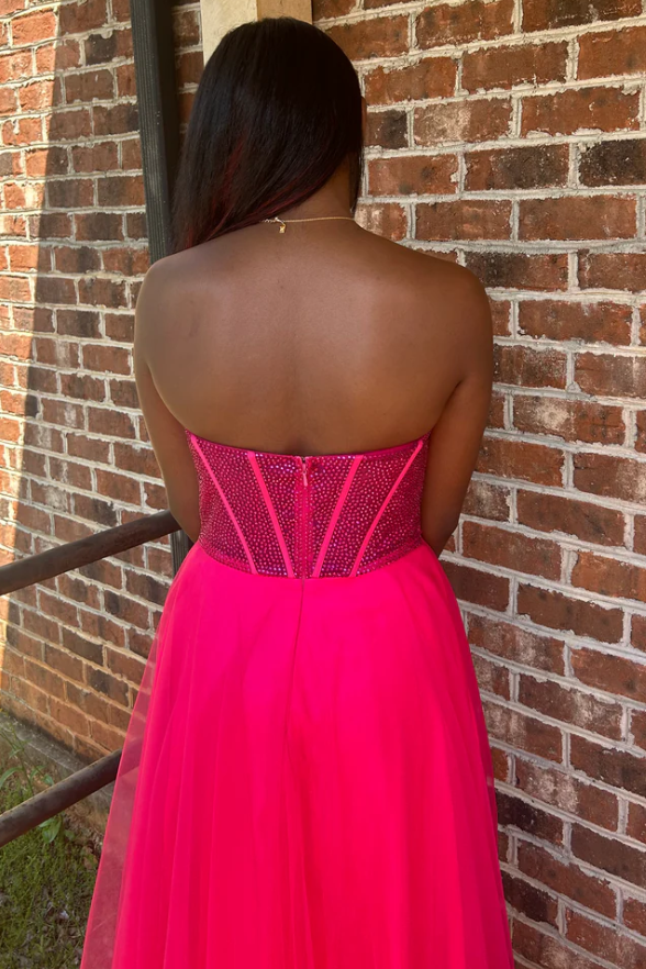 Adéntrate en un mundo de glamour con el vestido de graduación Abysmal, de corte imperio, sin mangas, con escote palabra de honor, cuentas y abertura. Este diseño deslumbrante luce una elegante silueta en A confeccionada en tul ligero que se mueve con fluidez, creando un efecto mágico mientras bailas toda la noche. Disponible en rosa fucsia y azul marino, este vestido largo hasta el suelo presenta un favorecedor escote palabra de honor y delicados adornos de cuentas que le dan un toque de brillo. El corte imperio realza tu figura, mientras que la sensual abertura en la falda deja entrever tus piernas para un toque atrevido y sofisticado. El cierre de cordones en la espalda garantiza un ajuste perfecto, brindándote comodidad y estilo durante toda tu noche especial. Este vestido es imprescindible para quienes buscan vestidos de noche y de gala exquisitos.