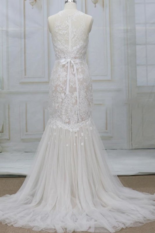 Haz que tu día especial sea aún más especial con este elegante vestido de novia de encaje color marfil con corte sirena. Con un escote impactante y una falda de estilo bohemio, este exquisito vestido de novia para bodas en la playa sin duda...