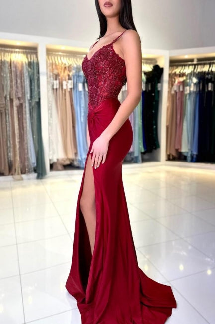 Este exquisito vestido de sirena para baile de graduación presenta impresionantes detalles de encaje y un sensual diseño de tirantes finos. El intenso color burdeos es a la vez seductor y elegante, mientras que la favorecedora abertura añade un toque de glamour. Perfecto para deslumbrar en cualquier ocasión formal.