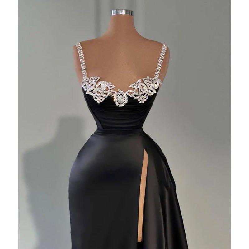 Atractivo vestido de fiesta largo con tirantes finos y cuentas, con aberturas.