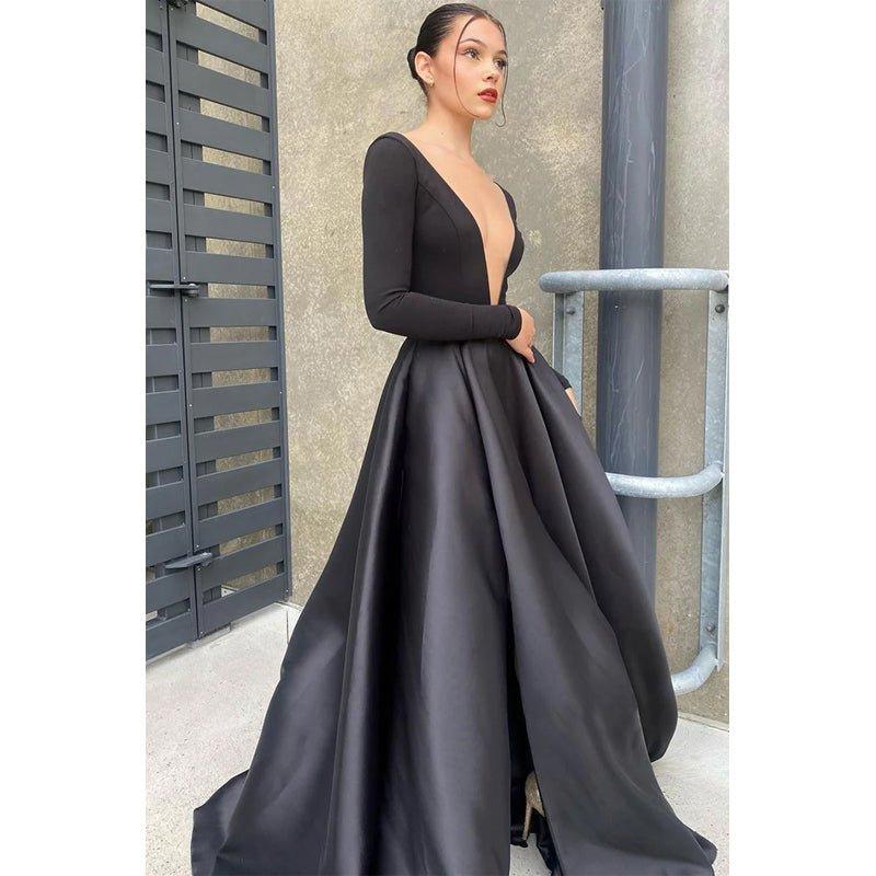 Atractivo vestido de fiesta negro con escote en V profundo, mangas largas y bolsillos