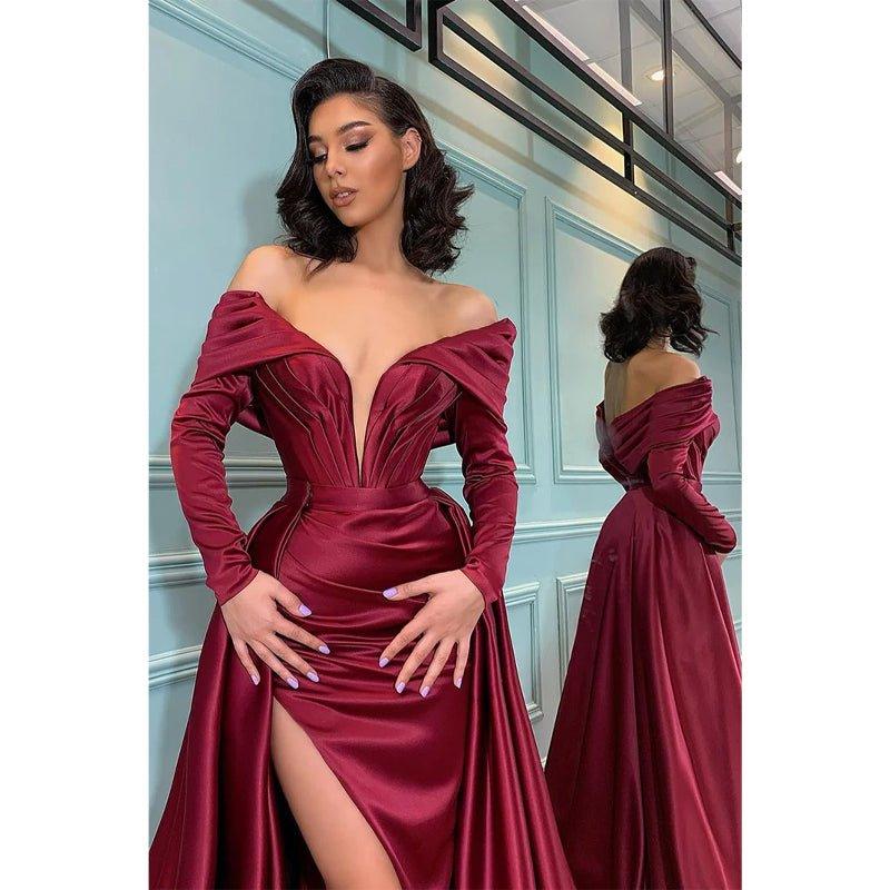 Atractivo vestido formal de sirena con escote en V profundo, pliegues de satén, mangas largas y abertura.
