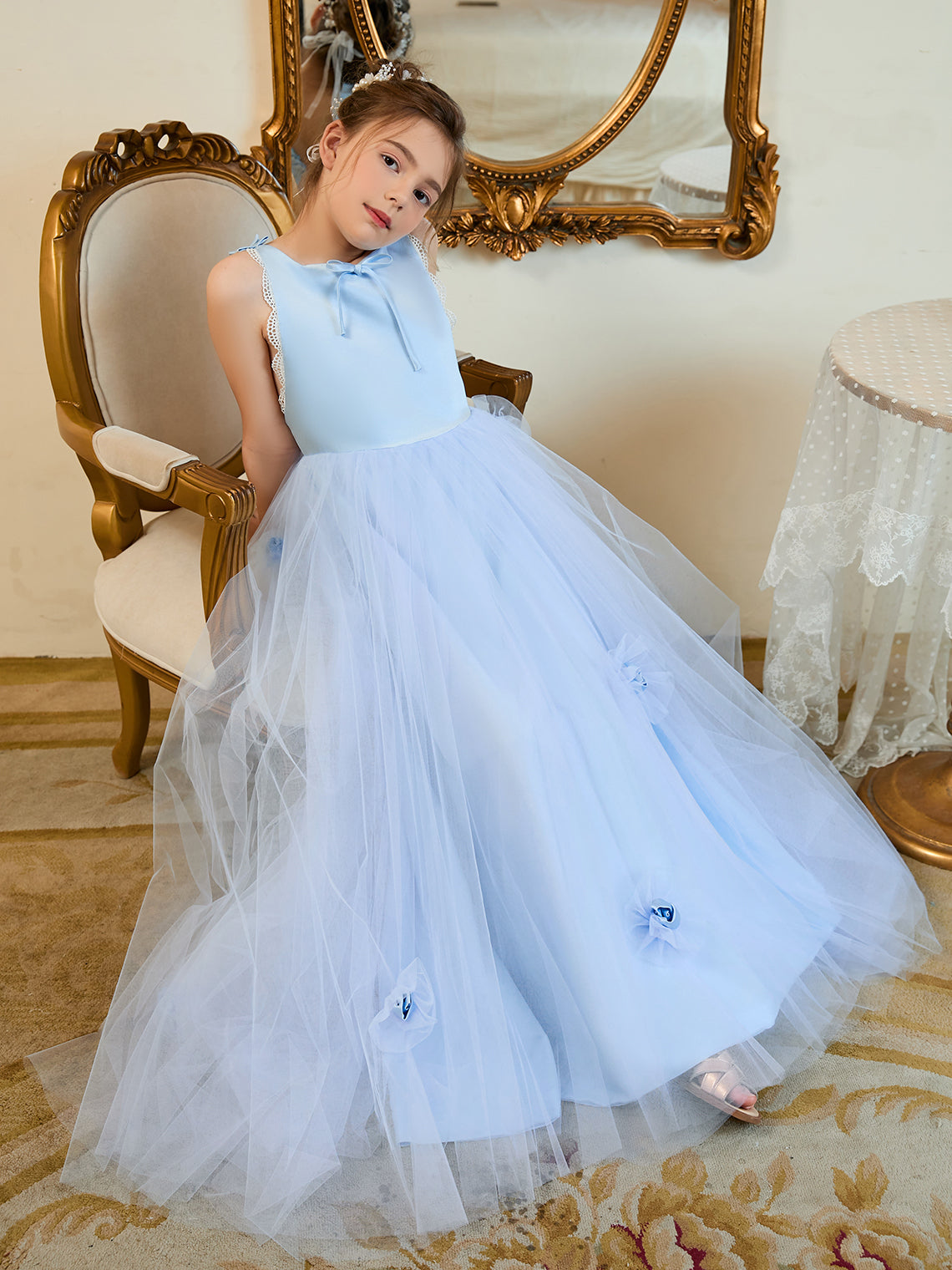 Vestido de niña de las flores azul con cola de tul estilo princesa/baila de baile