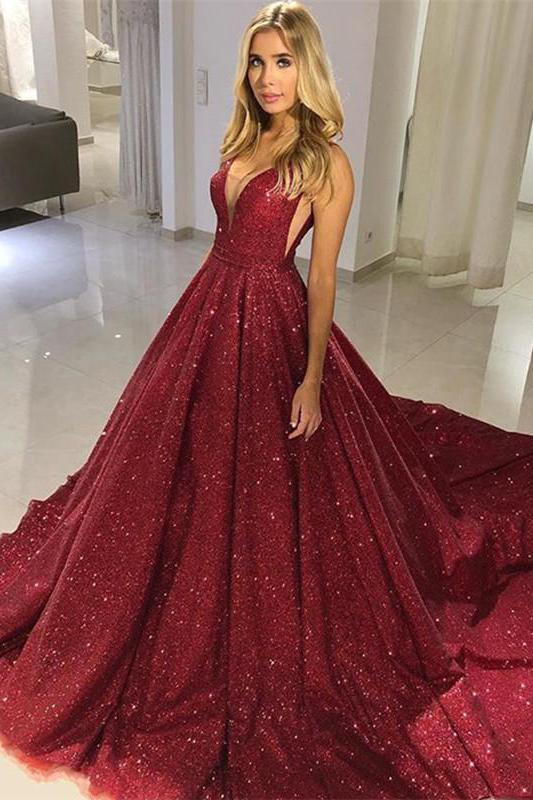 Vestido de gala sexy con escote en V profundo, tirantes finos y largo hasta el suelo, con lentejuelas.