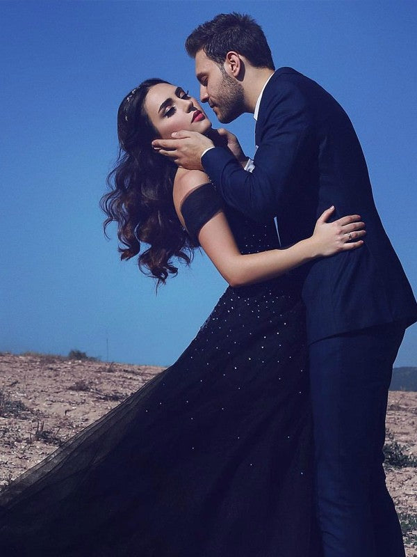Vestido de gala sin mangas con hombros descubiertos, de tul y con cuentas