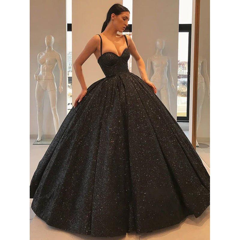 Vestido de noche formal con escote en forma de corazón, tirantes finos y brillo negro