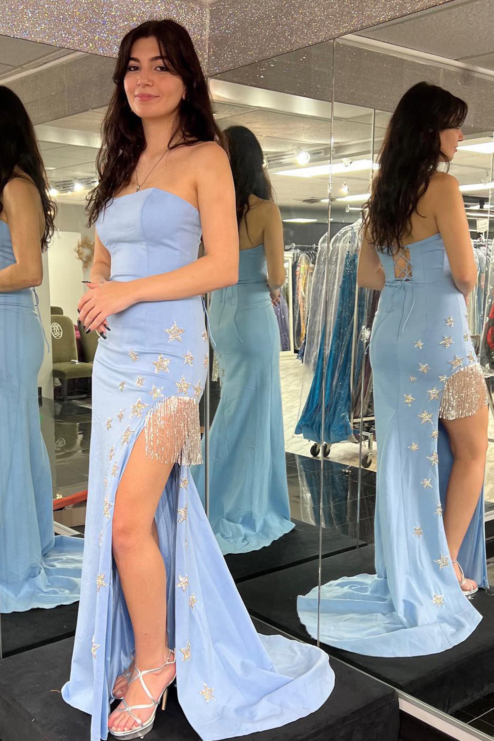 Brilla con luz propia con Collins, la quintaesencia de la elegancia celestial. Esta obra maestra de corte recto, cuidadosamente esculpida en lujoso satén elástico, se adapta a la perfección a cada curva, creando una silueta tan impactante como el cielo nocturno. El escote palabra de honor ofrece una atrevida visión, en elegante contraste con la discreta cola. Con cada movimiento, el bordado de estrellas capta la luz, atrayendo la atención hacia la tentadora abertura adornada con brillantes flecos de cuentas. El cierre de cordones en la espalda garantiza un ajuste personalizado, añadiendo un toque vintage.