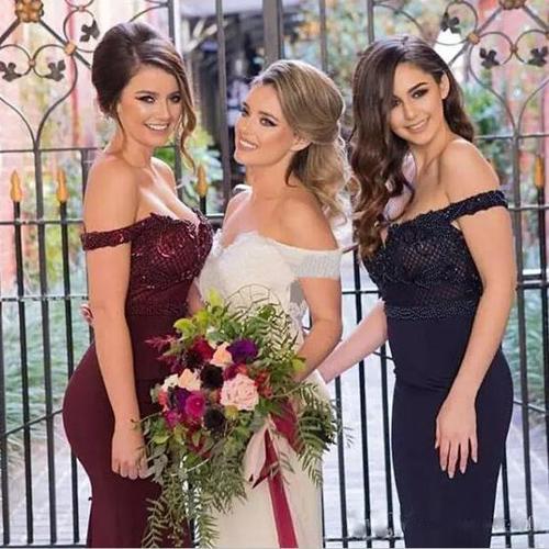 Impresionantes vestidos de dama de honor estilo sirena, color burdeos, rosa y azul marino, con hombros descubiertos y cola.