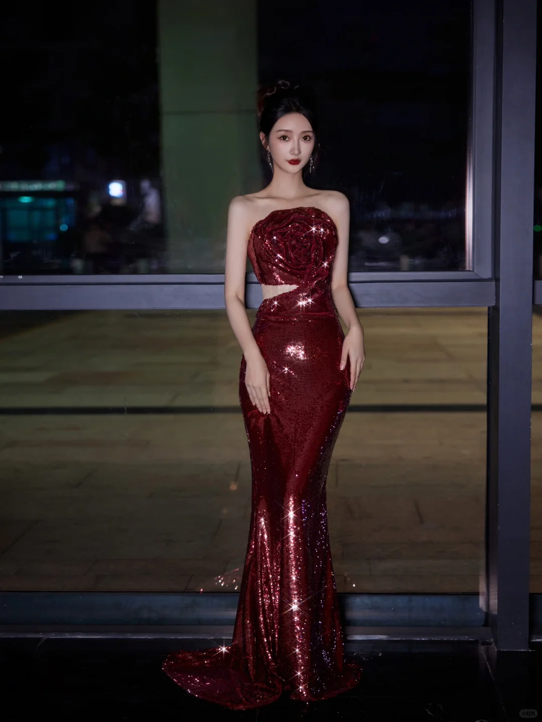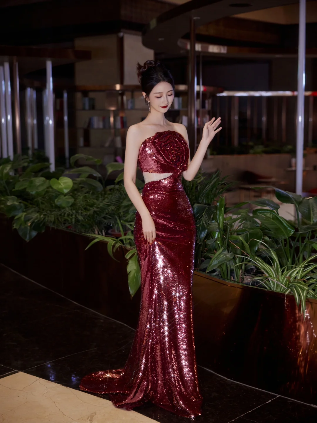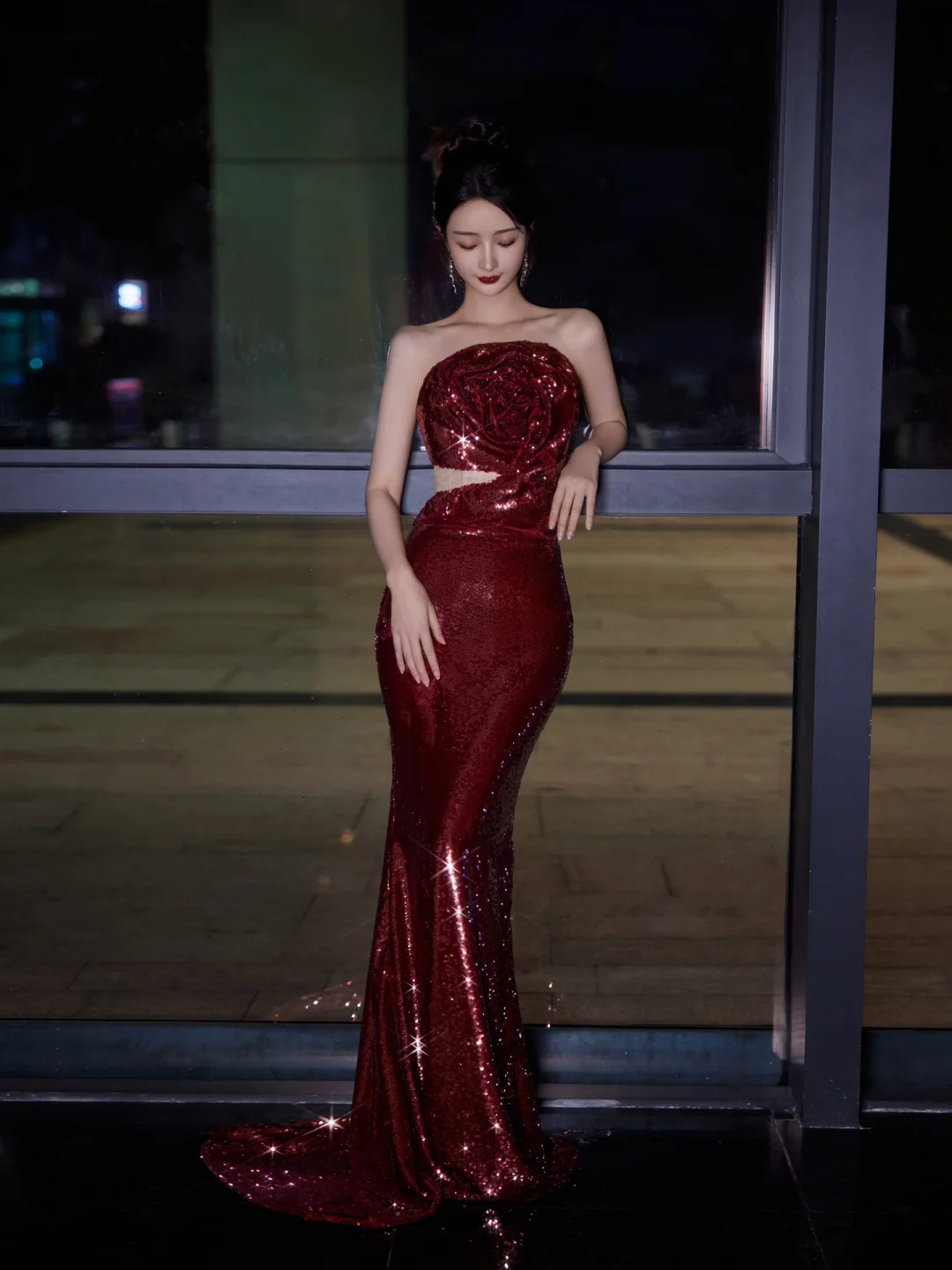 Vestido de fiesta largo de sirena color burdeos sin tirantes con lentejuelas y flores de rosas Y8595