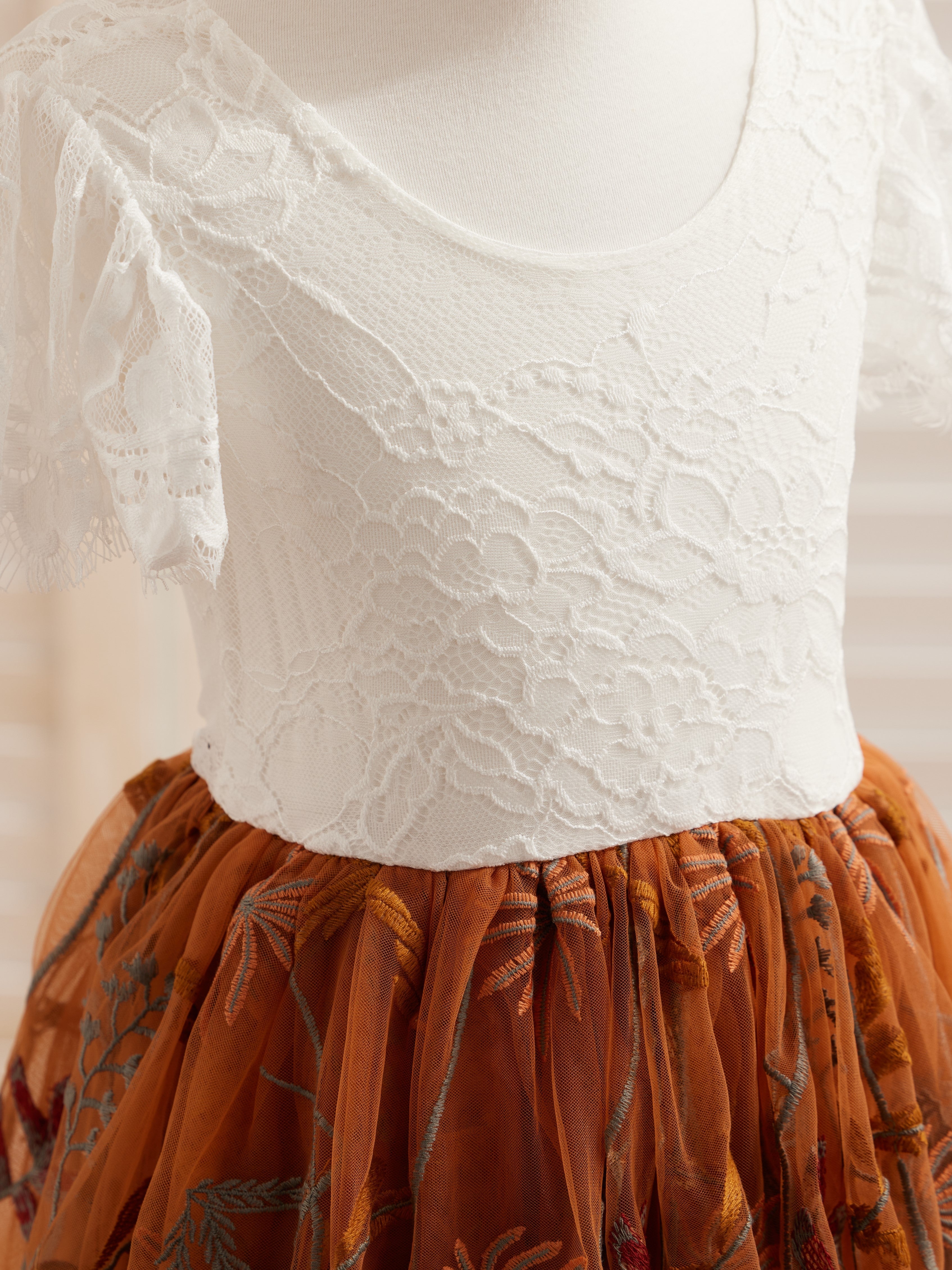 Vestido de niña de las flores color naranja quemado, blanco, encaje, tul y bordado hasta la rodilla