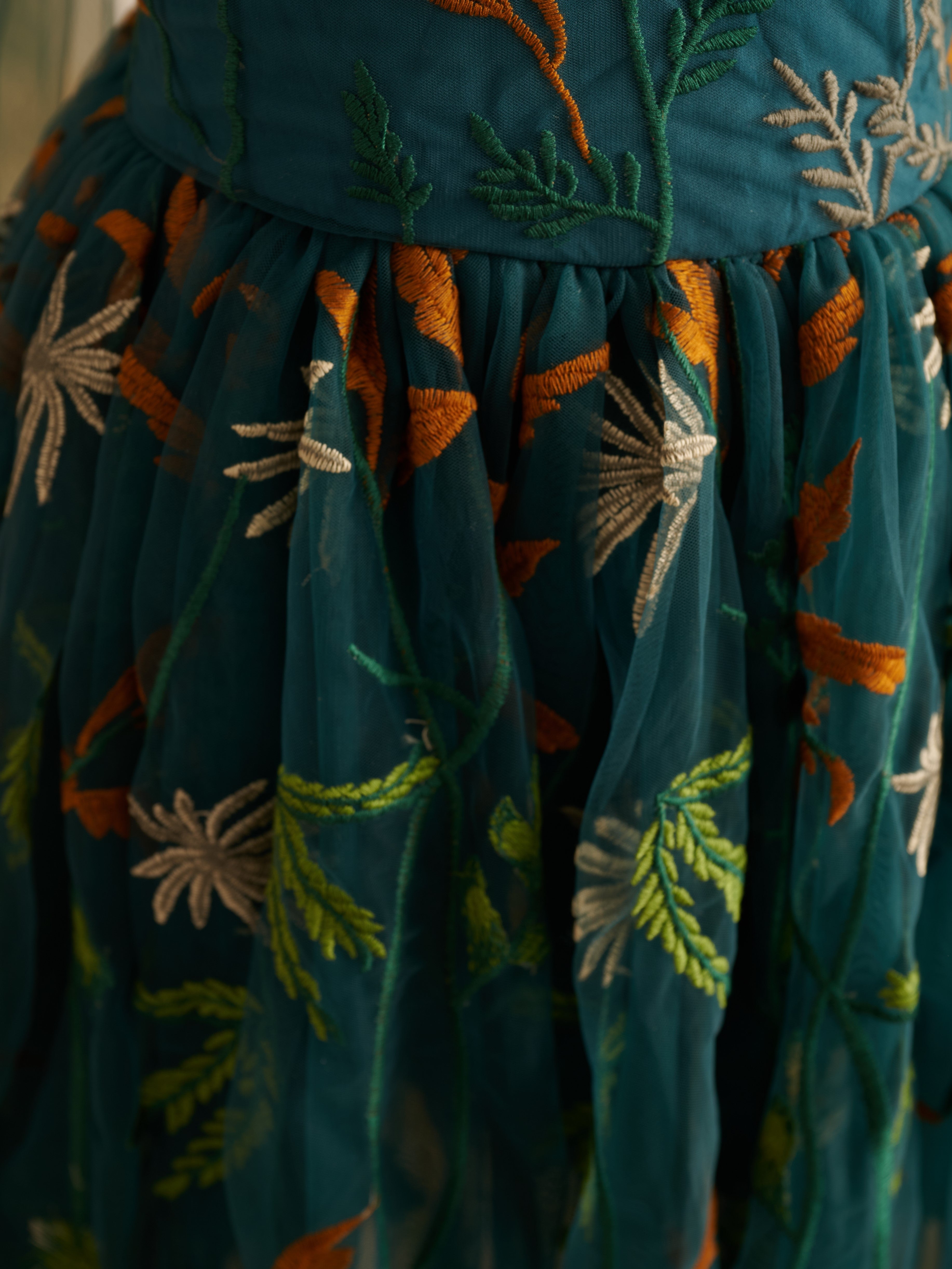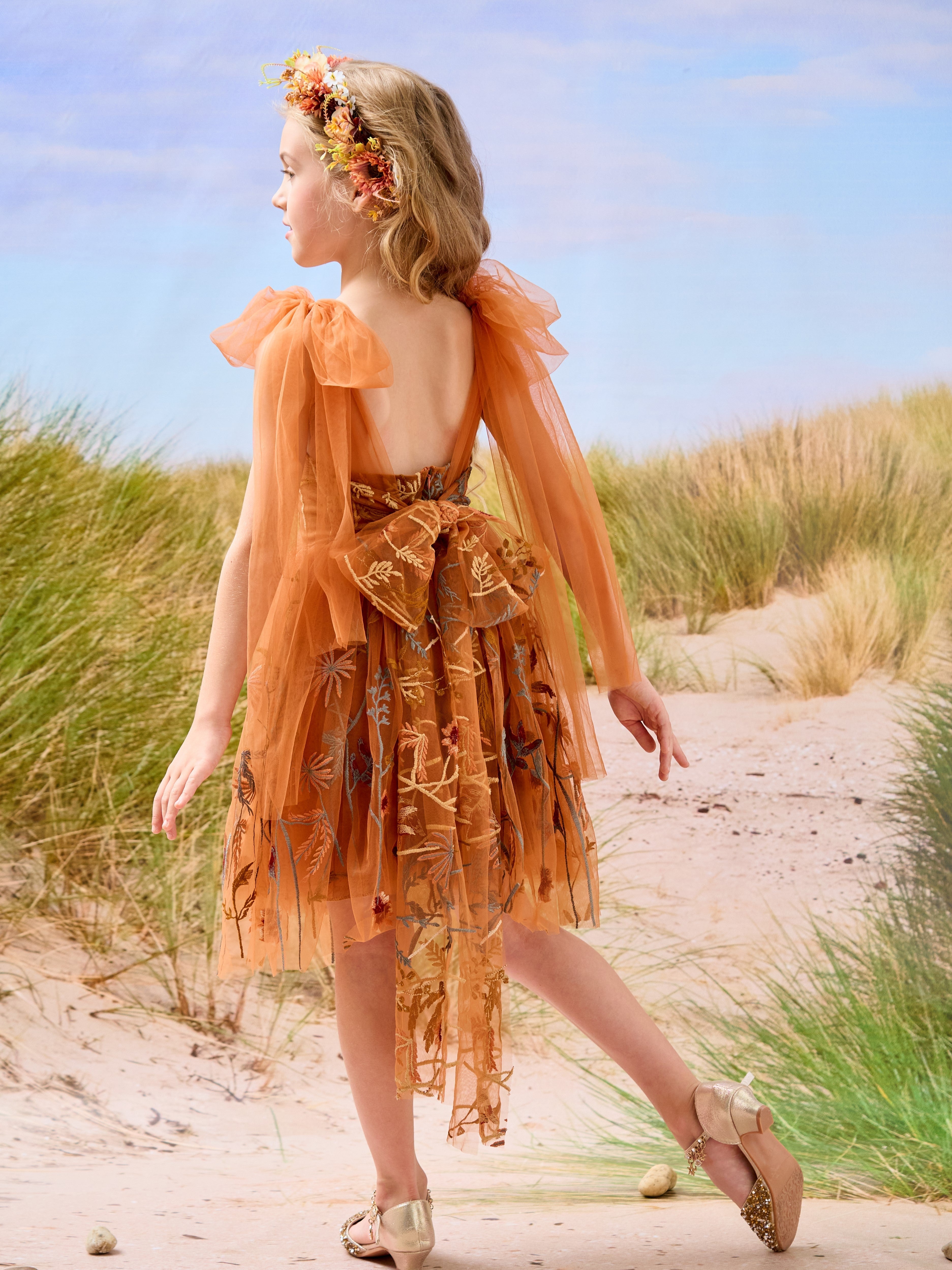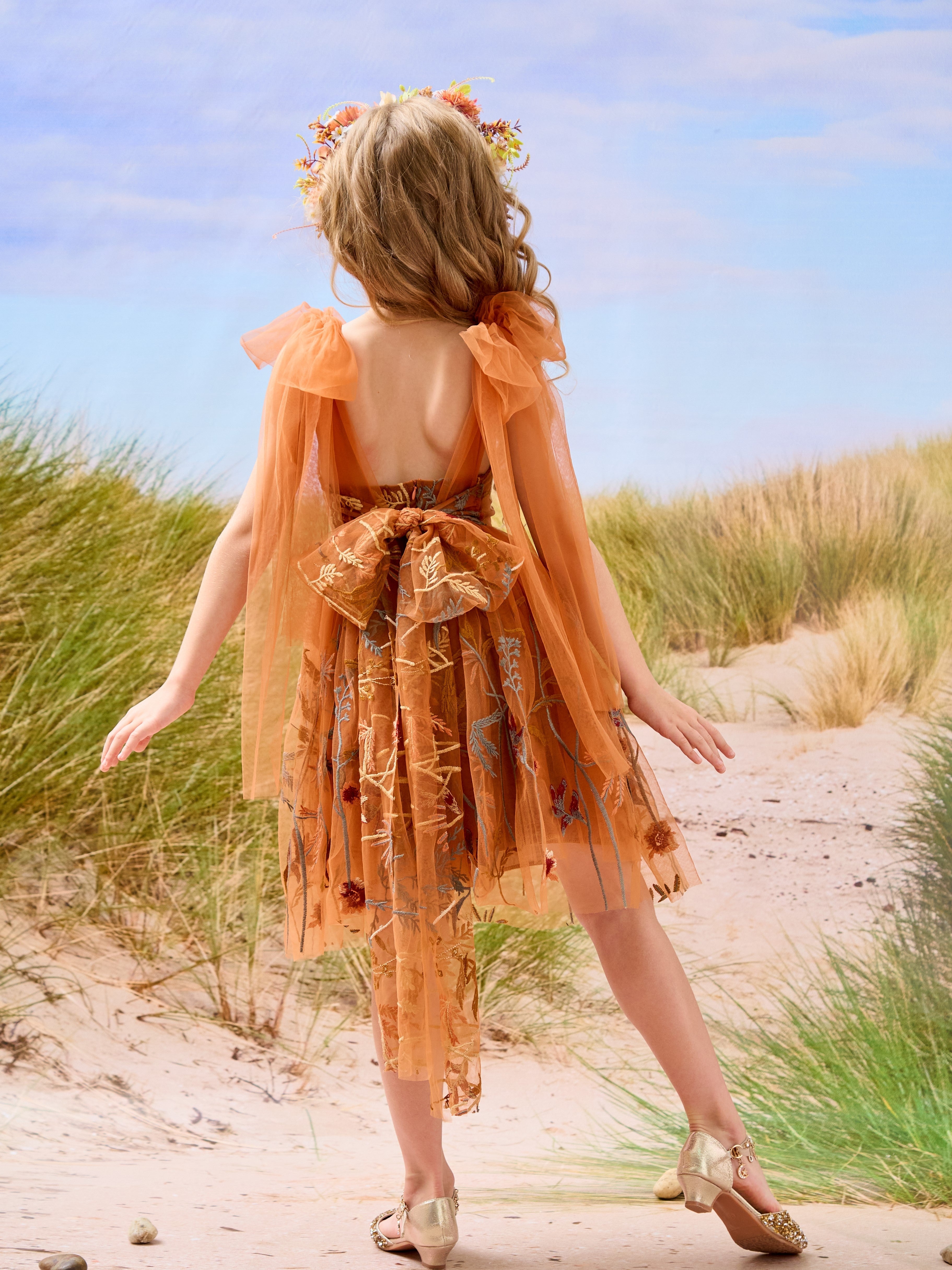 Vestido de niña pequeña hasta la rodilla, de encaje y tul color naranja quemado con bordados.