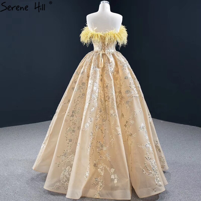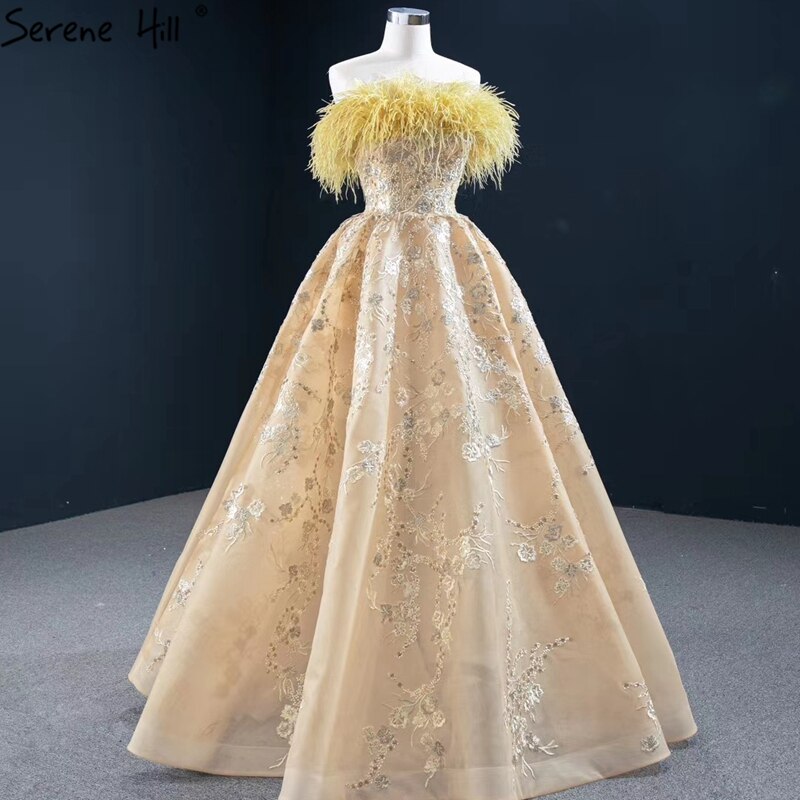 Vestido de noche sexy sin tirantes corte A color champán, con hombros descubiertos, plumas y brillo, modelo HM67164