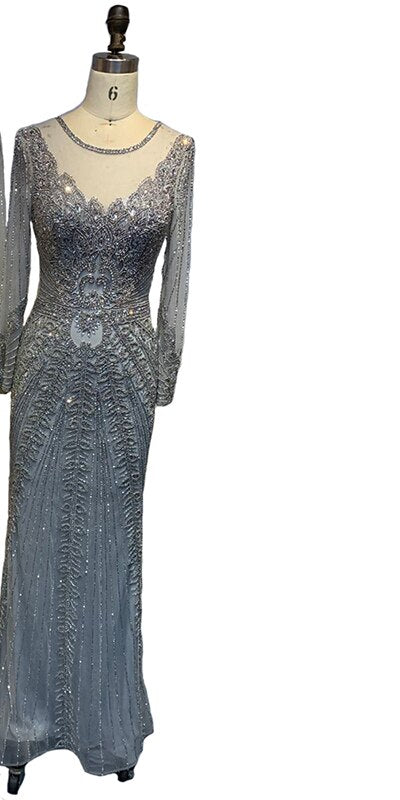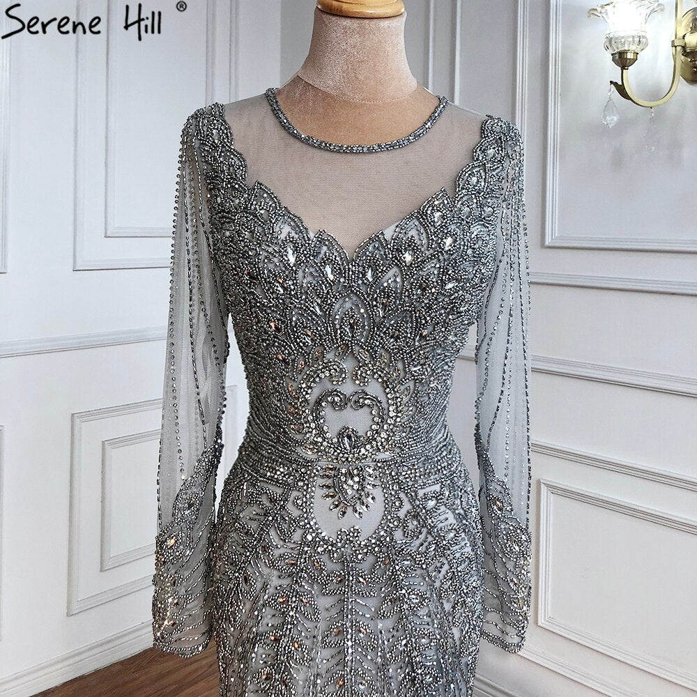 Vestido de noche de sirena de lujo color champán de Dubái, manga larga, con cuentas de diamantes, vestido formal 2025 LA70443