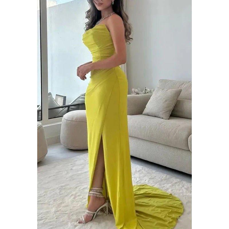 Vestido de fiesta elegante y chic con abertura fruncida, sin mangas y hombros descubiertos