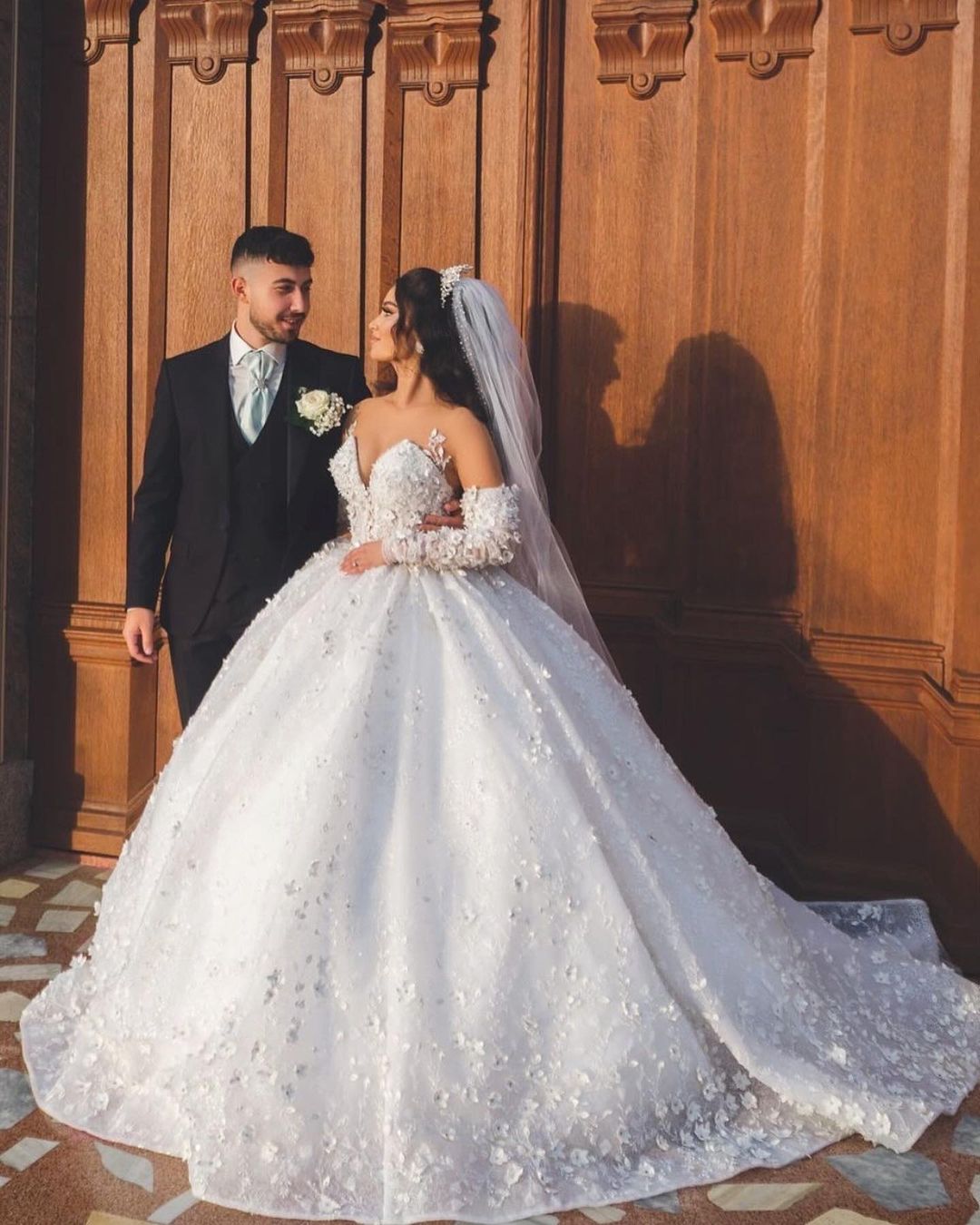 Este elegante vestido de novia largo blanco de corte en A y escote en V es una opción deslumbrante para cualquier novia. Los elegantes apliques y mangas le dan un toque de sofisticación, mientras que la cola le añade un aire dramático. Con su silueta clásica y sus hermosos detalles, este vestido es la combinación perfecta de estilo y gracia para tu día especial.
