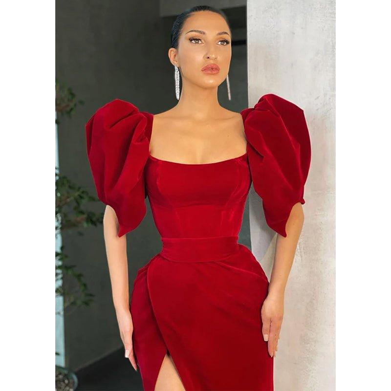 Elegantes vestidos de noche formales vintage con mangas abullonadas y abertura
