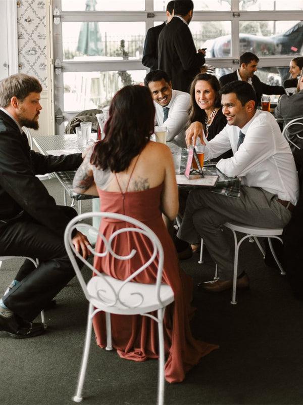 Haz que tus damas de honor luzcan espectaculares con los vestidos largos de gasa corte A con tirantes finos BD092. Estos vestidos color burdeos, de estilo recatado, juvenil y asequibles, aportarán un toque de sofisticación a tu día especial.