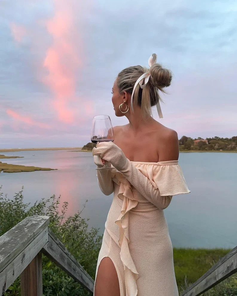 Elegante vestido largo de fiesta color crema con hombros descubiertos, volantes y abertura lateral Y7975