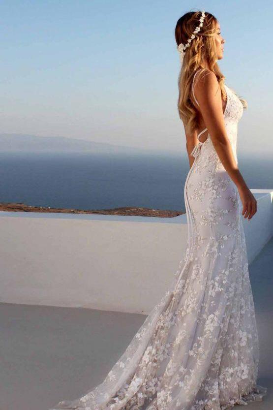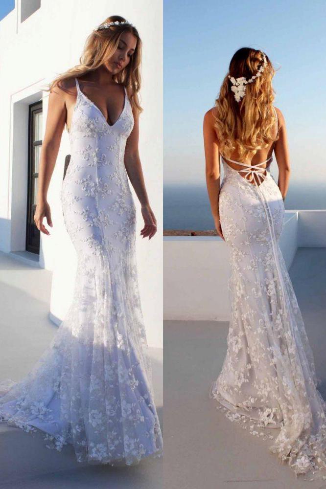Espacios: Playa / Destino. Iglesia. Jardín / Exterior. Salón. Detalles de la espalda: Sin espalda Estación: Primavera. Verano. Otoño. Invierno Escote: Escote en V Material: Encaje Silueta: Columna Estilo: Sexy Tipo de cuerpo: Señorita Tren: Tren de barrido/cepillado Largo de manga: Sin mangas Cintura: Natural Largo del dobladillo: Hasta el suelo Adornos: Apliques