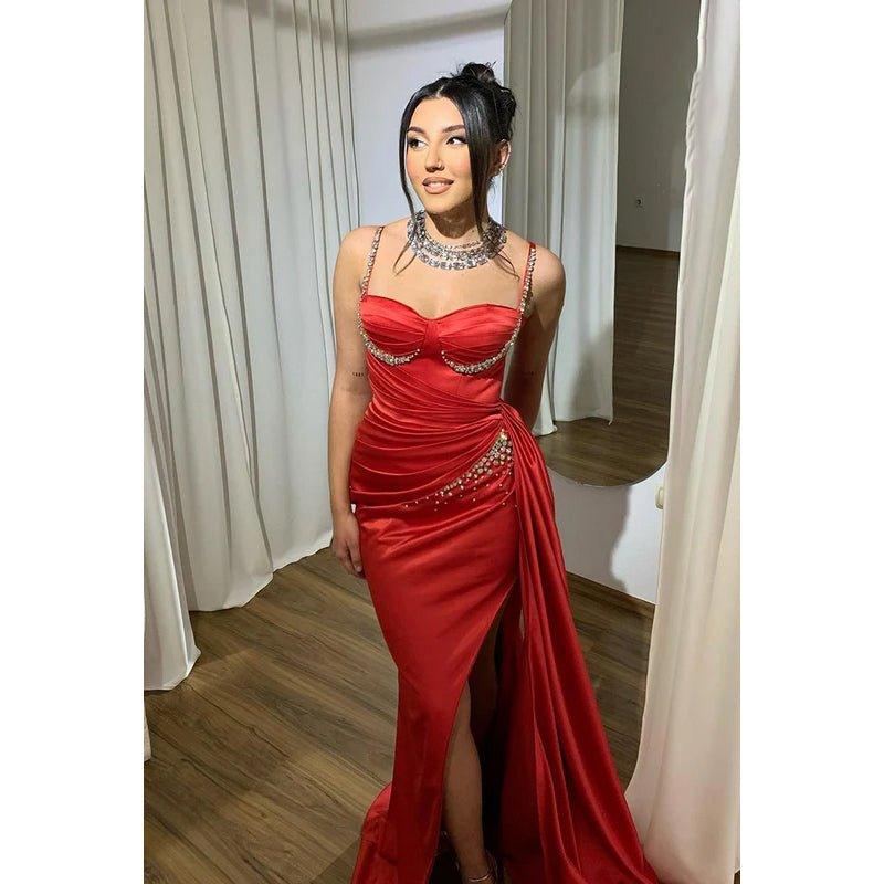 Vestido de fiesta de corte sirena con tirantes finos, abertura lateral y fruncido, con pedrería y alta costura.