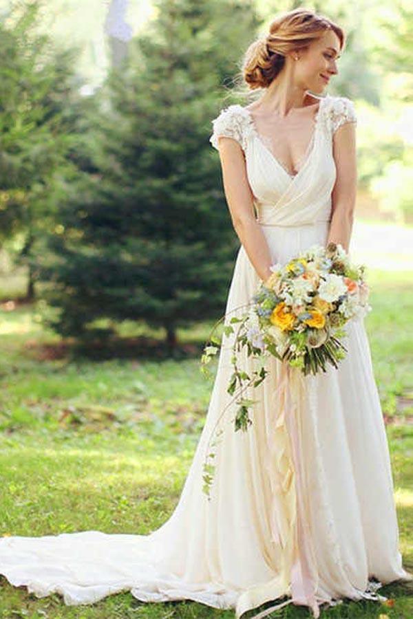 Este elegante vestido de novia de corte ajustado, con escote en V profundo y mangas casquillo, presenta una espalda transparente adornada con delicadas aplicaciones de encaje para un look atemporal. Perfecto para tu día especial. El escote ilusión y las mangas casquillo crean una silueta romántica y sofisticada.