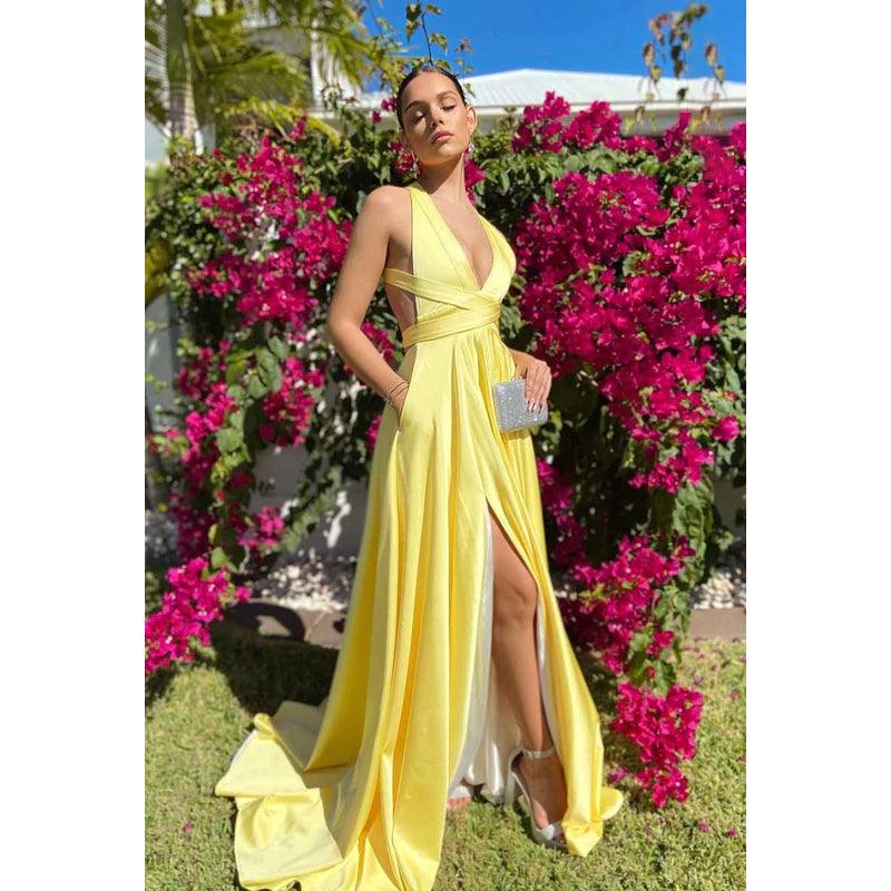 Vestido de fiesta de corte A con escote en V profundo, tirantes cruzados y abertura