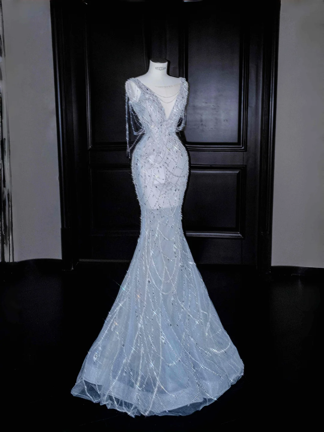 Vestido de noche largo de sirena con escote en V, tul azul sueño y cadena de cuentas Y8665
