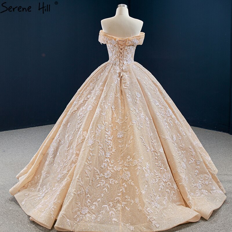 Vestidos de novia Dubai Gold con diseño de hombros descubiertos, colección 2025, flores hechas a mano con pedrería, vestidos de novia sexys HM67135, hechos a medida.