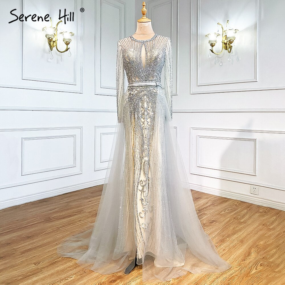 Vestido de noche gris de lujo de manga larga en Dubái, con escote redondo, corte sirena y detalles de diamantes, talla grande 2025 LA70116