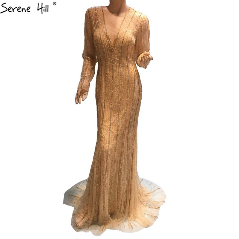 Rebajas en Dubái. Nuevos vestidos de noche de sirena dorados, moda 2025. Vestido de fiesta de noche sexy y lujoso con mangas largas y pedrería (LA6629).