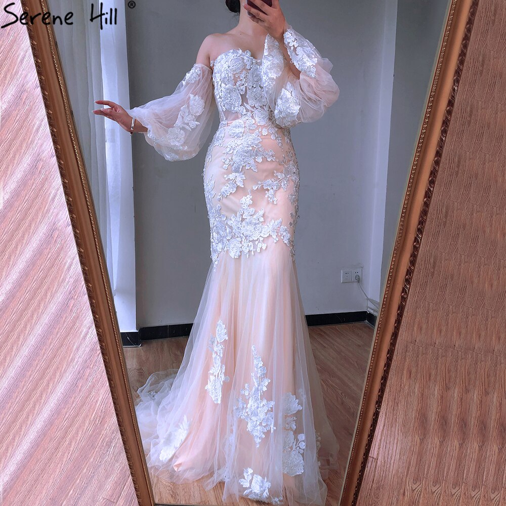 Vestidos de novia estilo sirena, color blanco nude, sexys, estilo Dubai, colección 2025, con mangas abullonadas, flores y pedrería. Modelo LA70417. Hechos a medida.
