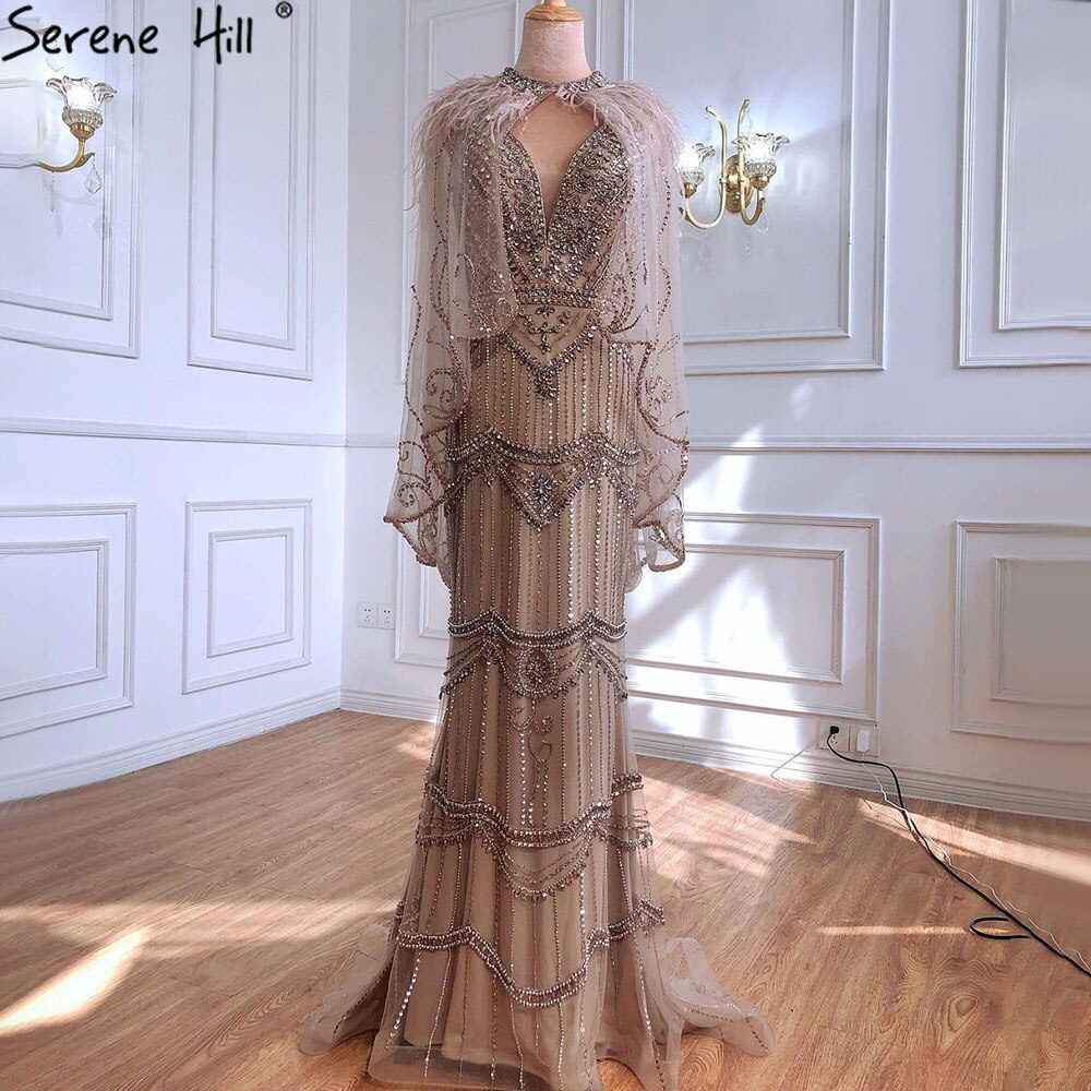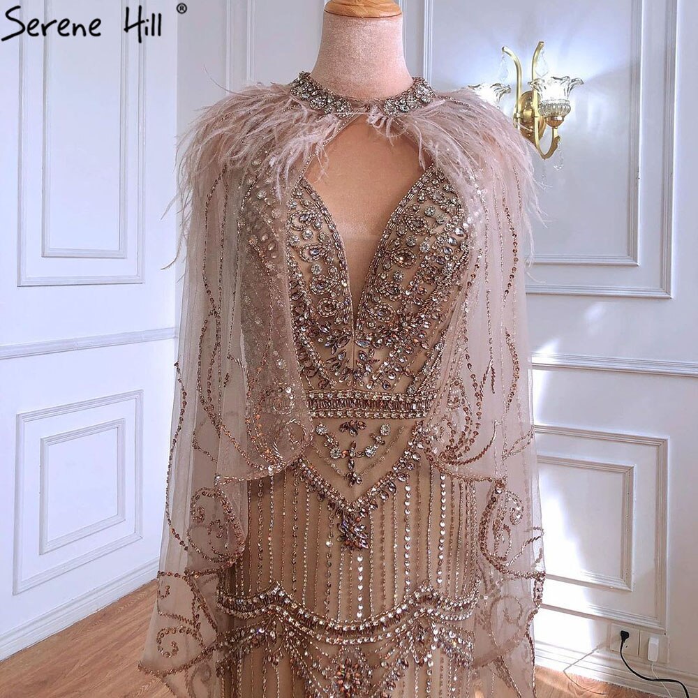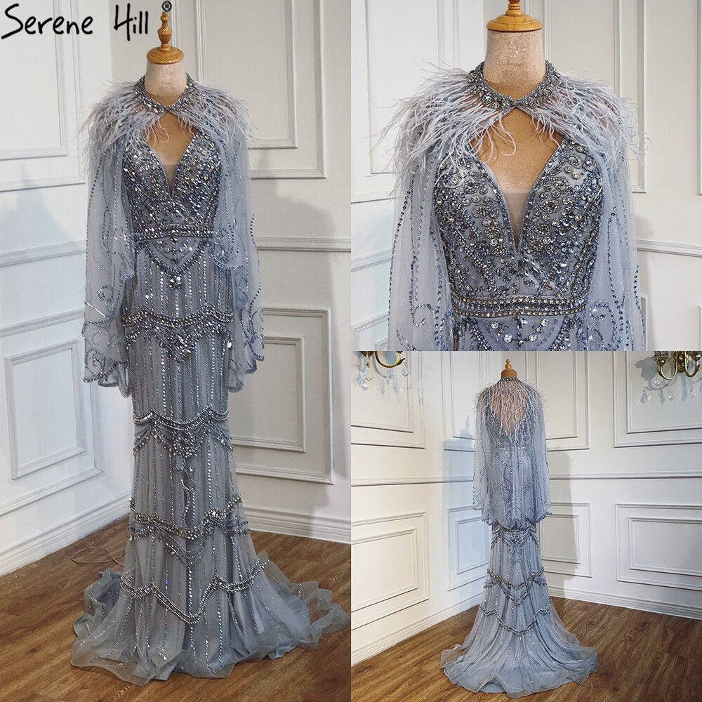 Vestido de noche sexy estilo sirena con escote en V color púrpura de Dubái, sin mangas, con chal de hilo y plumas, modelo LA70171A