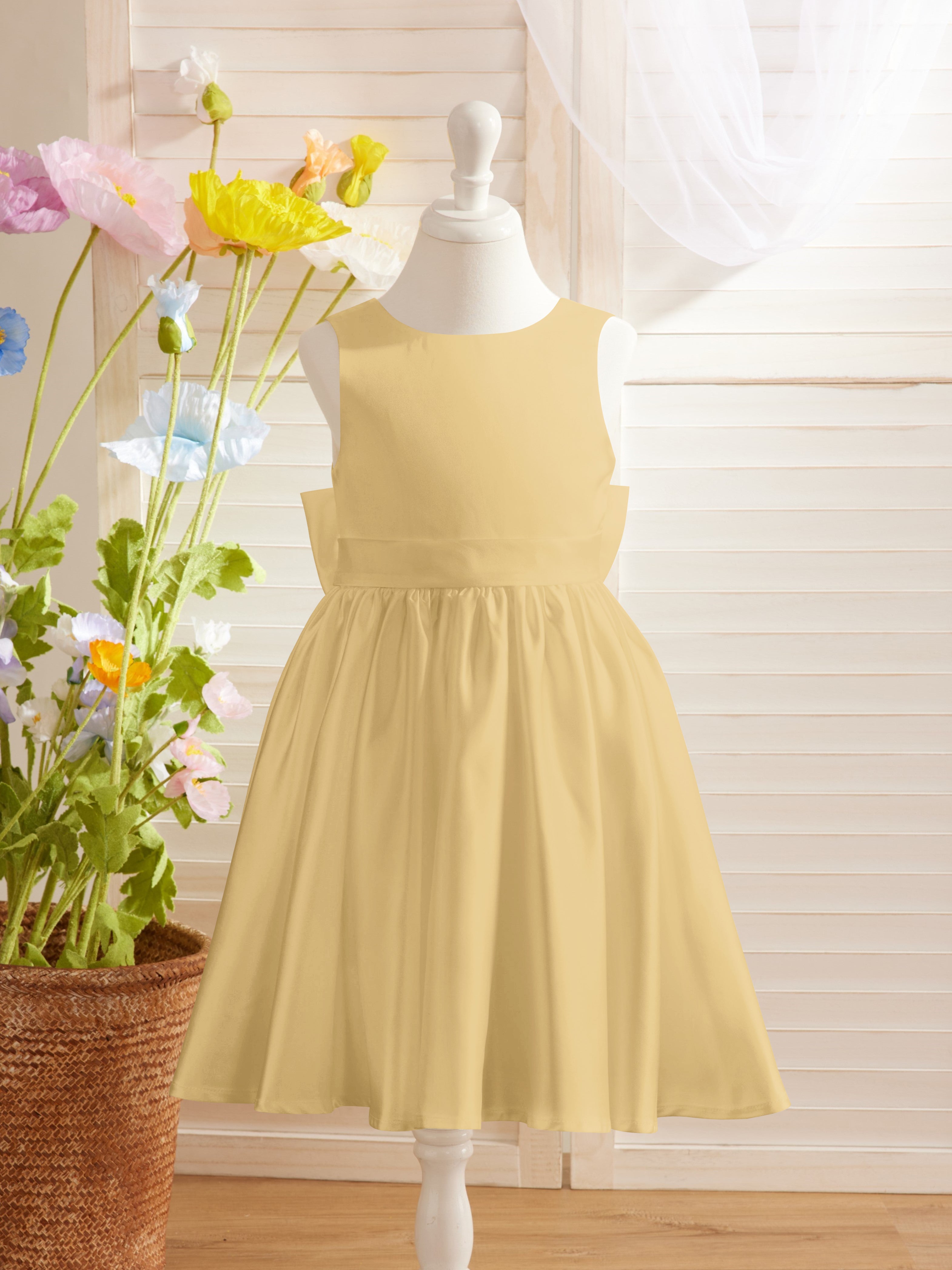 Elegante vestido de niña de las flores de satén con corte en A, espalda en V y lazo, hasta la rodilla