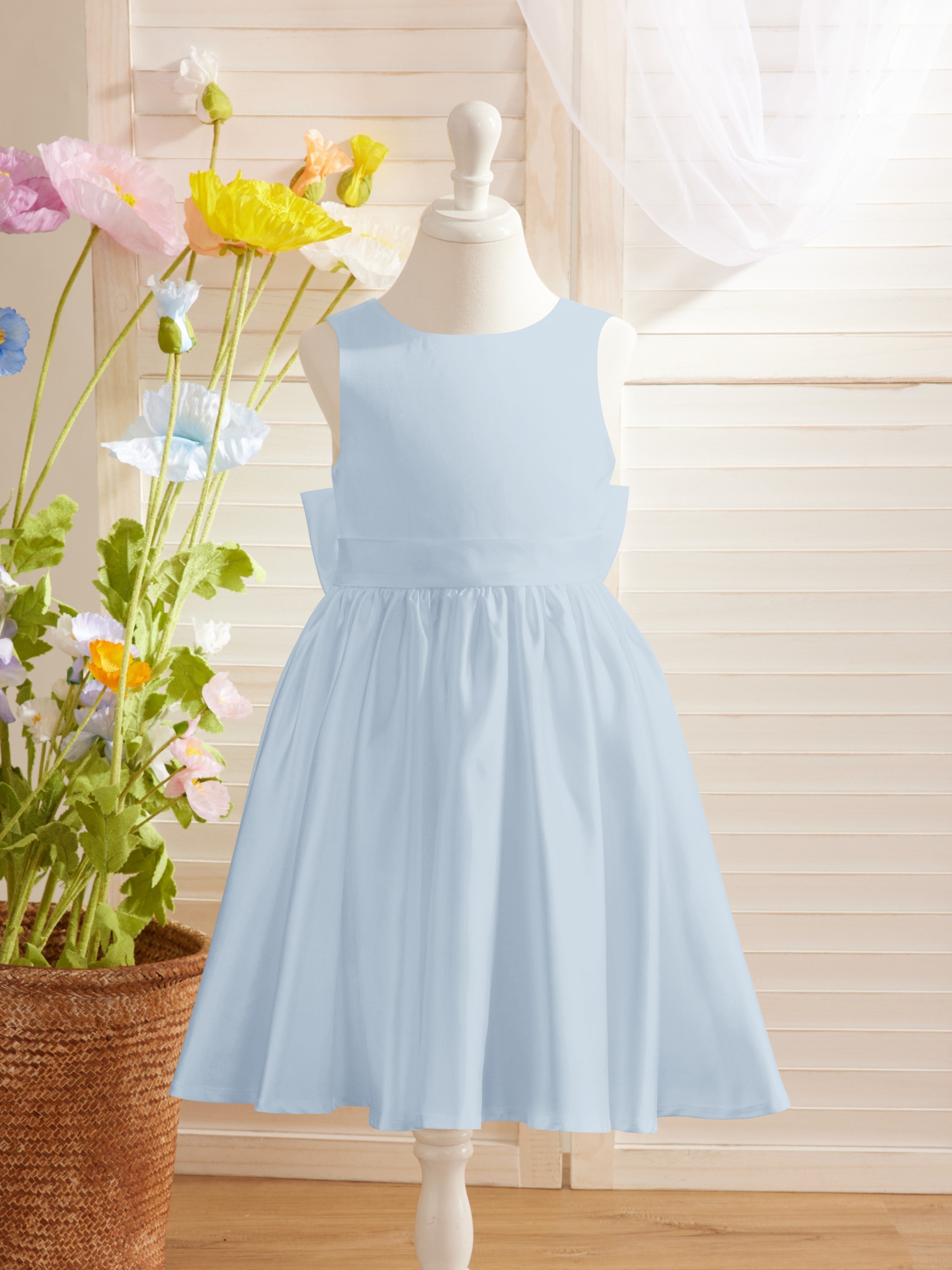 Elegante vestido de niña de las flores de satén con corte en A, espalda en V y lazo, hasta la rodilla