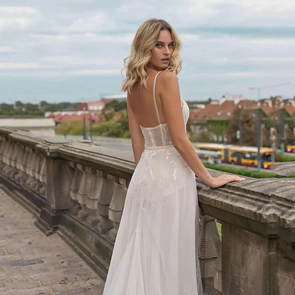 Vestidos de novia elegantes para la playa con aberturas altas, tul, apliques de encaje bohemio, vestidos de novia sin espalda.