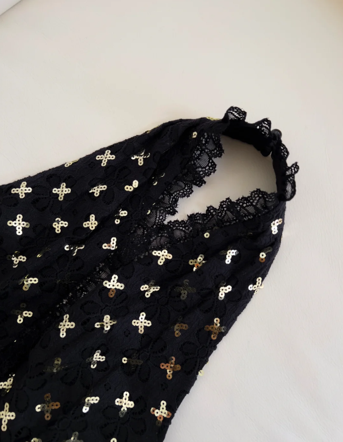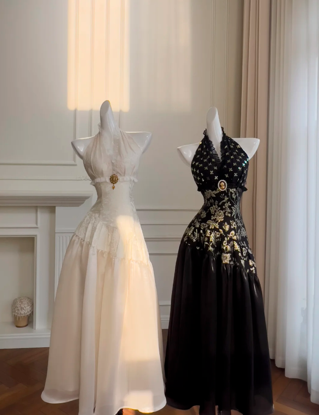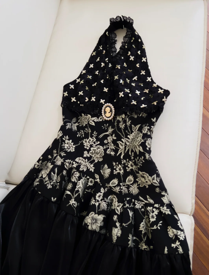 Elegante vestido de noche negro con escote halter, estampado floral, lentejuelas y corte en A, estilo vestido de fiesta largo Y8568
