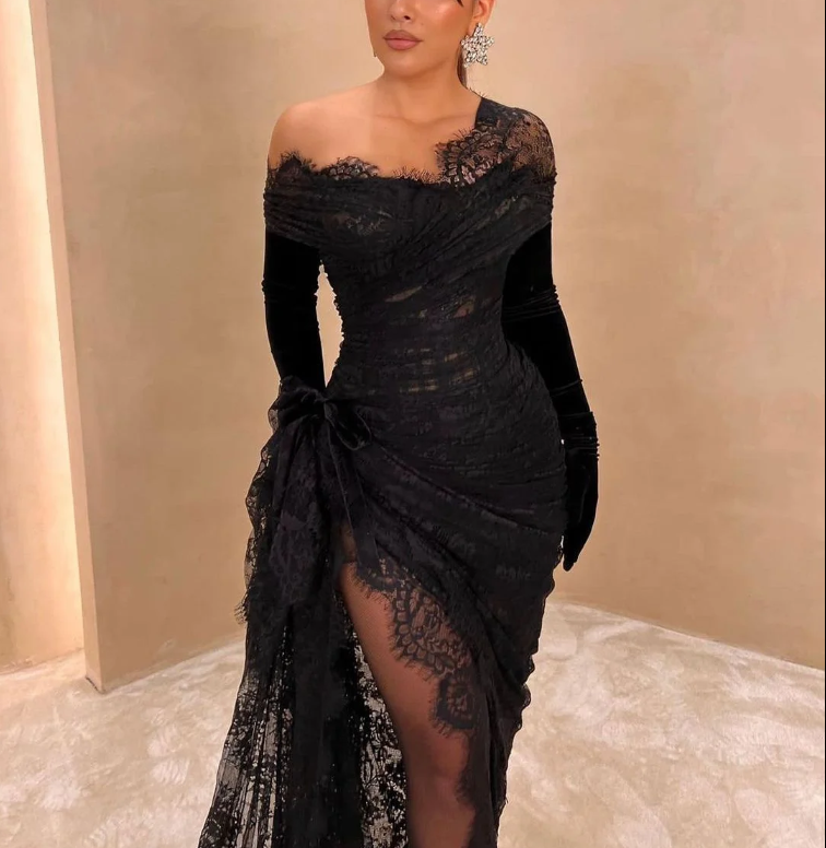 Elegante vestido de fiesta largo de encaje negro asimétrico con abertura alta Y7984