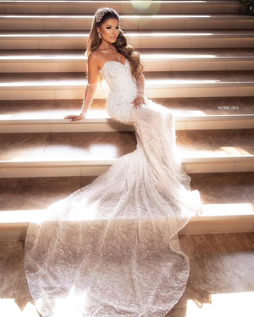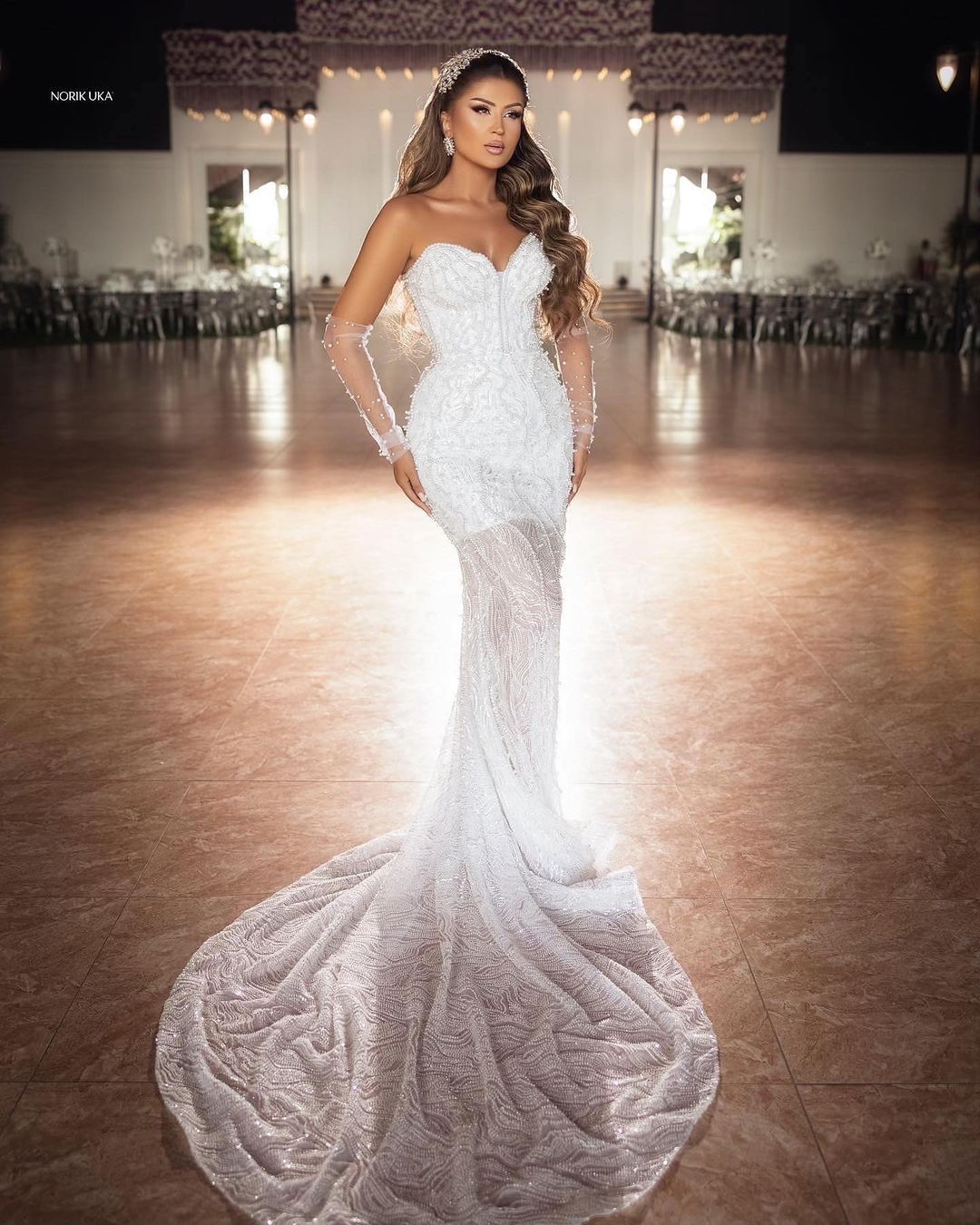 Logra una belleza atemporal con este elegante vestido de novia largo hasta el suelo. Confeccionado con escote corazón, encaje y delicados bordados, este diseño de sirena sin mangas es perfecto para tu día especial.