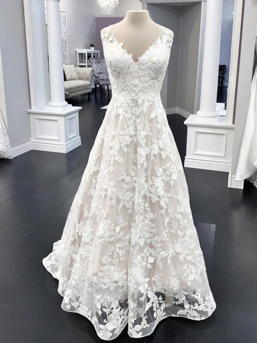 Vestidos de novia largos y elegantes de corte A con escote en V y encaje floral