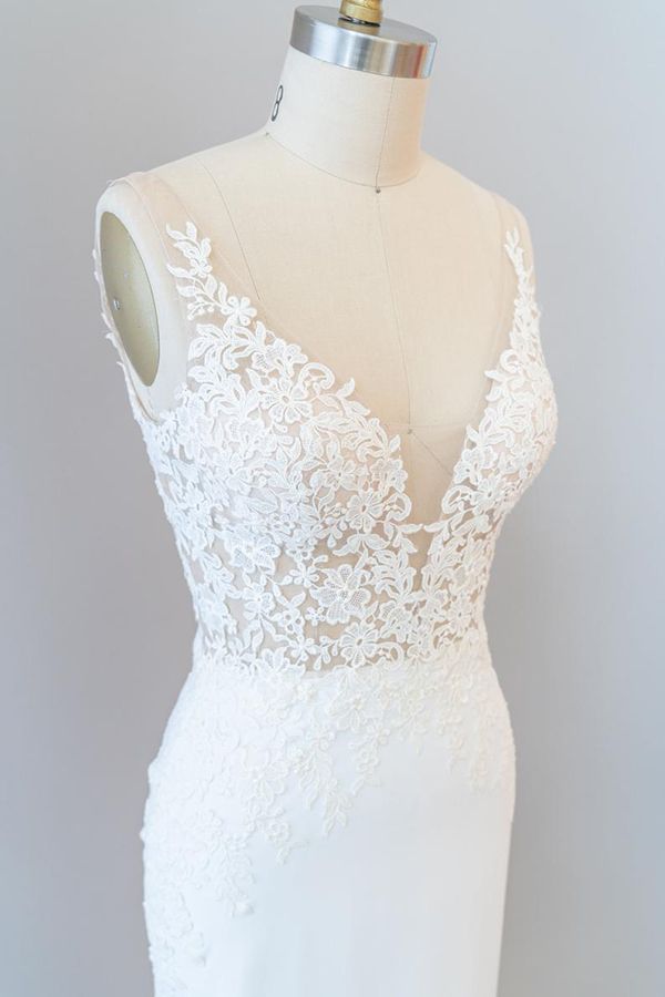 Espacios: Playa / Destino.Iglesia.Jardín / Salón al aire libre Detalles de la parte posterior: Botón Temporada: Primavera.Verano.Otoño.Invierno Escote: Escote en V Material: Tul Silueta: Columna Tipo de cuerpo: Talla grande. Largo de manga: Sin mangas. Cintura: Natural Largo del dobladillo: Hasta el suelo Adornos: Encaje.Aplicaciones