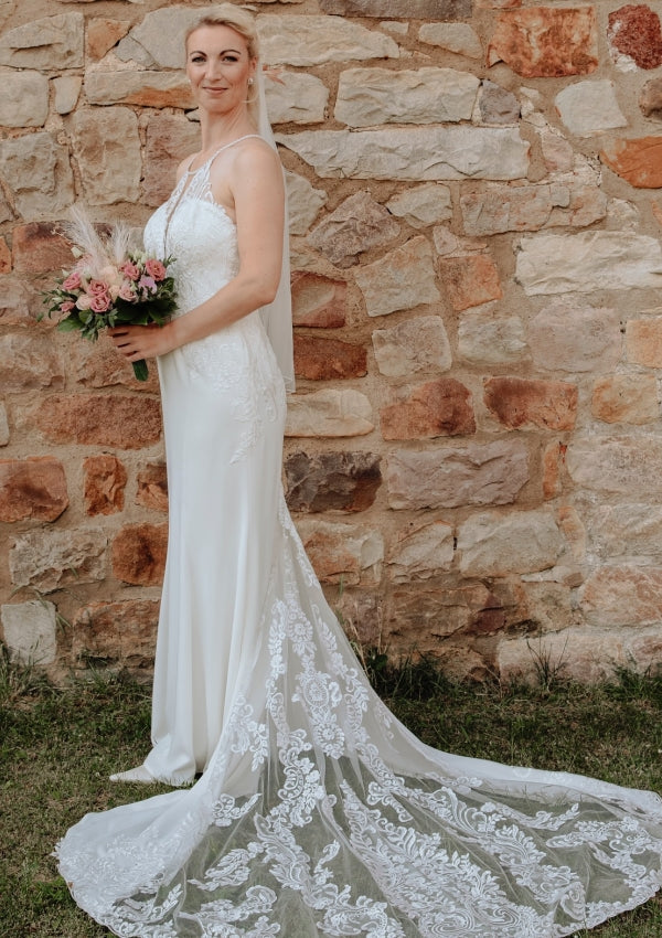 Este vestido de novia irradia elegancia con su silueta sirena, su diseño sin mangas y sus intrincados detalles de encaje. El impactante diseño de espalda descubierta añade un toque de sensualidad, mientras que la cola aporta el glamour perfecto. Ideal para una novia sofisticada y romántica que busca deslumbrar en su día especial.